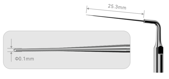 TFRK-S характеризуется очень острым коническим кончиком: диаметр кончика 0,1 мм с конусностью 1%. Инструмент можно предварительно изогнуть, чтобы адаптировать его к форме корневого канала.
